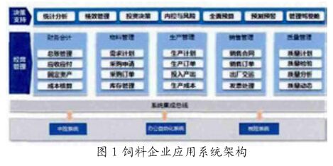(6)在原料入庫、銷售出庫環節與地磅數據緊密關聯,保證ERP系統數據的即時、準確……針對該企業在管理及業務方面的需求,以下這一系統構架比較適用。首先,實施經營管理層的ERP系統,同時建立飼料企業的其它系統如中控、辦公自動化、稅控等系統與ERP系統的緊密集成。實現企業內部物流、資金流、信息流的三流合一。然后建立決策支持層的BI(商務智能)系統,滿足企業內部各種經營分析的需求。如圖1所示: