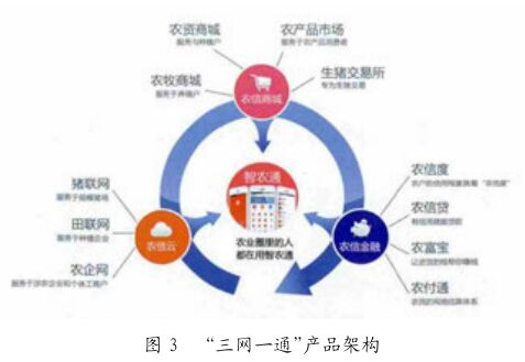 智慧大北農是運用移動互聯網、物聯網等先進思想與技術,將公司、員工、事業伙伴、同行融合在一張巨大的“網”上,通過智能化、網絡化、終端化的手段顛覆公司、客戶及行業的傳統管理、營運及商業模式,推動大北農業務線上線下高度融合,建立基于農村的人、信息和商務三者協同發展的PIB新模式,將大北農打造成為一個高科技、互聯網化和類金融的現代農業創業服務平臺。以數據管理為內容為主的農信云、以商品交易為主的農信商城、以金融服務為主的農信金融,外加上把以手機聯通三者業務的智農通,構成“三網一通”產品架構,如圖3。