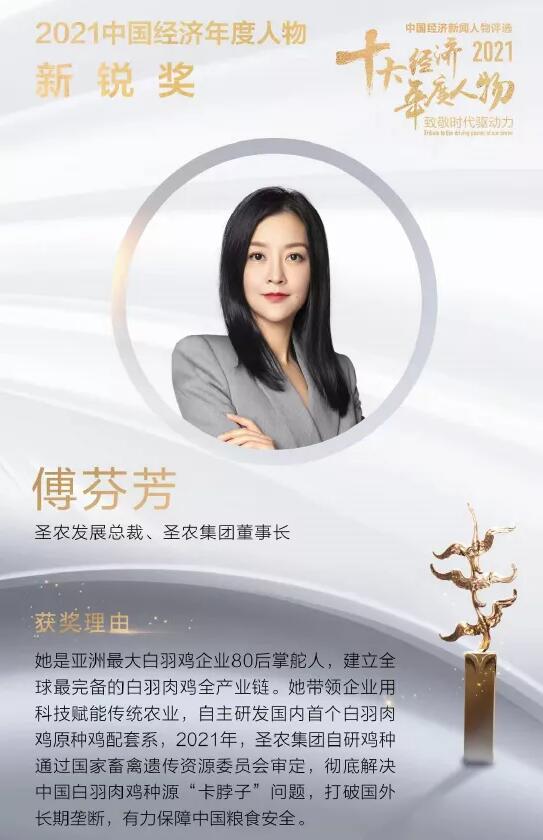 她是亞洲最大白羽雞企業80后掌舵人,建立全球最完備的白羽肉雞全產業鏈。她帶領企業用科技賦能傳統農業,自主研發國內首個白羽肉雞原種雞配套系,2021年,圣農集團自研雞種通過國家畜禽遺傳資源委員會審定,徹底解決中國白羽肉雞種源“卡脖子”問題,打破國外長期壟斷,有力保障中國糧食安全。