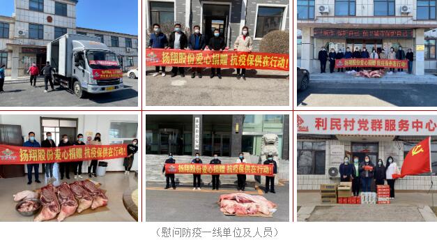 面對疫情威脅,揚翔股份北方區總裁孫文平迅速集結員工形成防疫小隊,在3月23日——4月3日期間,為沈陽新民市各大鄉鎮、防疫主力單位、疫情防控點共36個地方送去了溫暖,包括現金、豬肉、泡面、水、防護服、牛奶、口罩等,有一份力量發一份光。