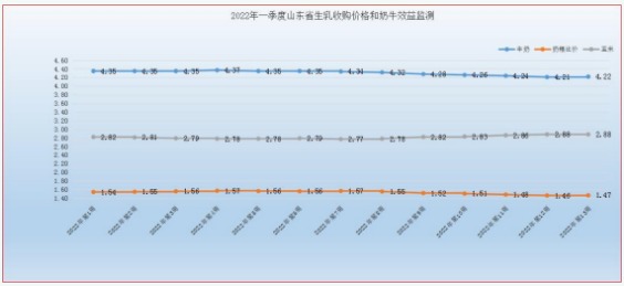 2、養殖收益:2022年第一季度我省奶價呈現高位回落態勢,一季度我省生鮮乳平均交售價格為4.23元/公斤,環比降低1.63%,同比降低1.17%;按月度監測來看,1-3月份我省生鮮乳平均交售價分別為4.32、4.26、4.12元/公斤。第一季度奶糧比價均值為1.51,環比降低1.31%,同比升高2.68%,一季度奶牛養殖收益低于去年四季度,但略高于去年同期。