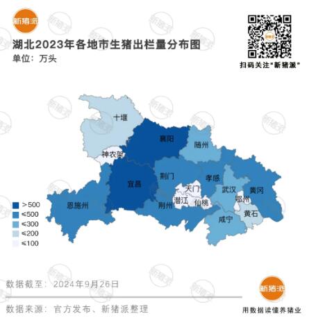 據官方數據,湖北的生豬主產區主要為襄陽、宜昌、黃岡、恩施州、荊門、荊州、孝感7個地市,其2023年生豬出欄量均在300萬頭以上,合計3245萬頭,占全省的73%。其中除了恩施州外,其余6個地市規模豬場數量在全省排名靠前,也是正大、牧原、溫氏、雙胞胎、新希望等集團豬企的布局重地。