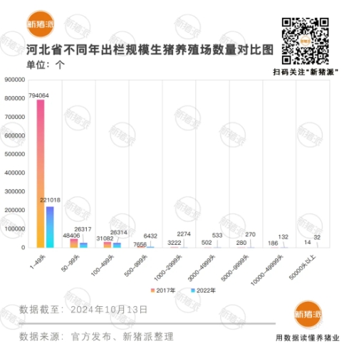 將2022年與2017年進行比較,河北9個出欄等級的豬場中,除3000-4999、50000頭以上的豬場數量有少量增加外,其余7個等級的豬場數量均明顯減少。反觀在廣東、廣西、湖南等南方省份,年出欄3000頭以上的豬場數量至少增加了20%。