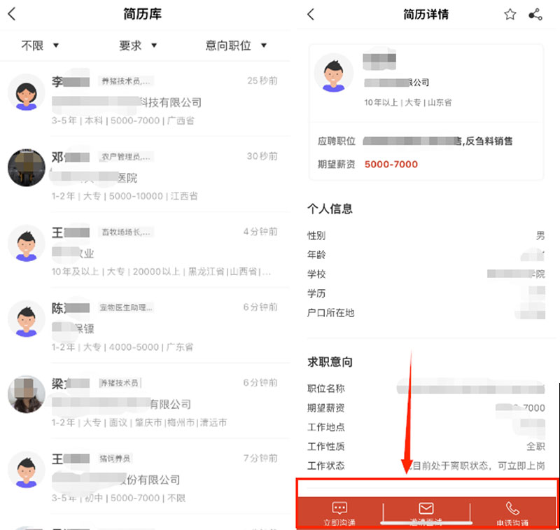 備注:只有已辦理正式會(huì)員的企業(yè)用戶才可以下載求職者簡(jiǎn)歷,才能主動(dòng)發(fā)送即時(shí)信息、面試邀約及電話溝通。