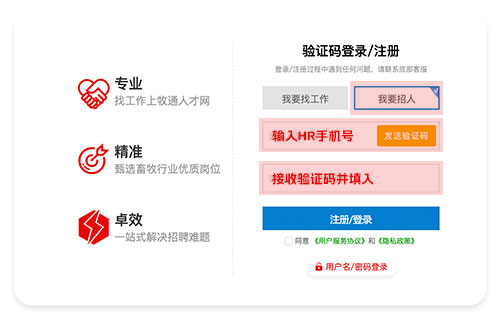 1、注冊(cè)/登錄時(shí)請(qǐng)?zhí)顚懻鎸?shí)有效的電話號(hào)碼,便于您日后登陸和接收求職者應(yīng)聘信息。