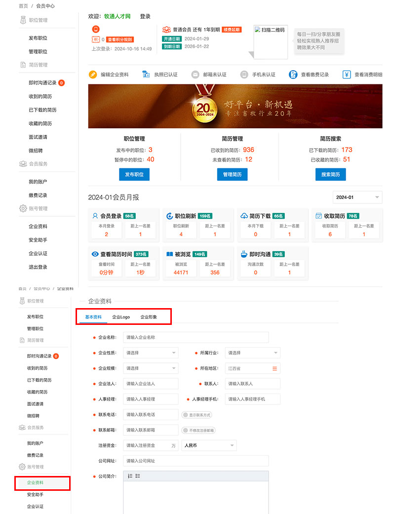 2、注冊(cè)完成后跳轉(zhuǎn)到企業(yè)會(huì)員中心。(如下方圖2)左下方找到“企業(yè)資料”,及時(shí)填寫公司詳細(xì)信息,包括基本資料、企業(yè)logo、企業(yè)形象。讓求職者更好地了解企業(yè)概況,吸引更多求職者關(guān)注。然后點(diǎn)擊“企業(yè)認(rèn)證”,上傳企業(yè)資質(zhì)材料,平臺(tái)審核通過后即可發(fā)布職位。