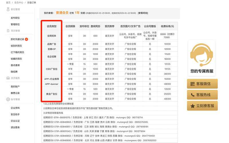 4、如下圖,點(diǎn)擊“開通會(huì)員”可見具體收費(fèi)標(biāo)準(zhǔn)。也可前往會(huì)員中心,右側(cè)有聯(lián)系客服通道,通過咨詢客服選擇符合企業(yè)招聘需求的會(huì)員套餐。